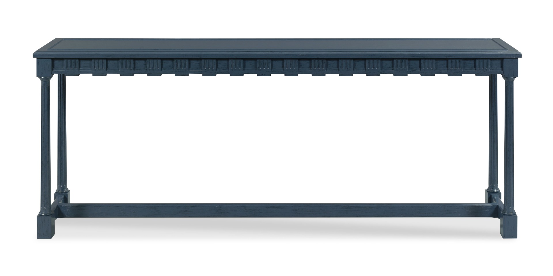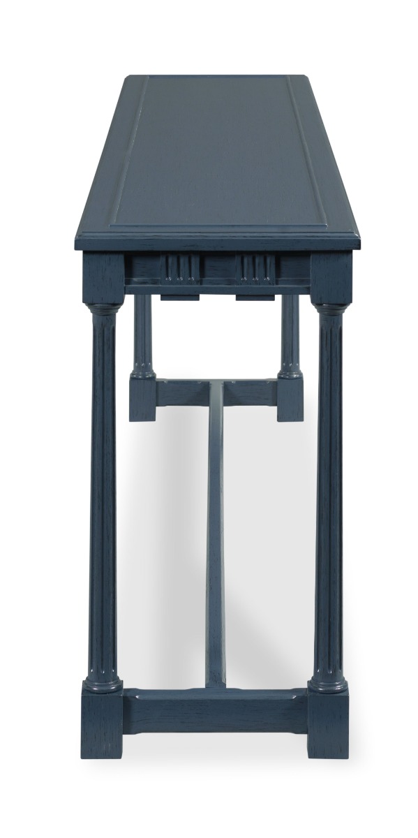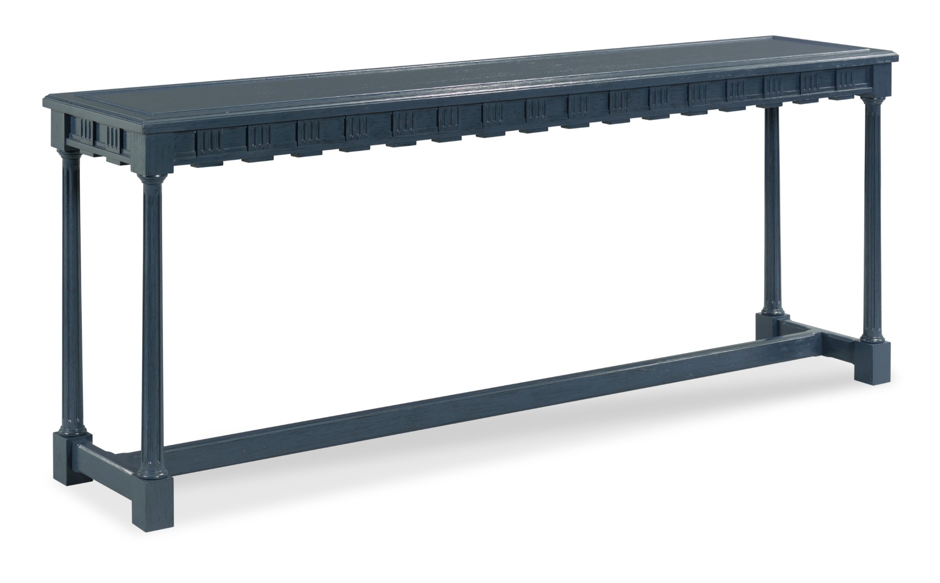This stately console features a grand scale and versatility with a center stretcher and is finshed with detailed fretwork on both sides as a sofa table or floating option in any room.Material: hardwood solids and quarter sawn oak veneer