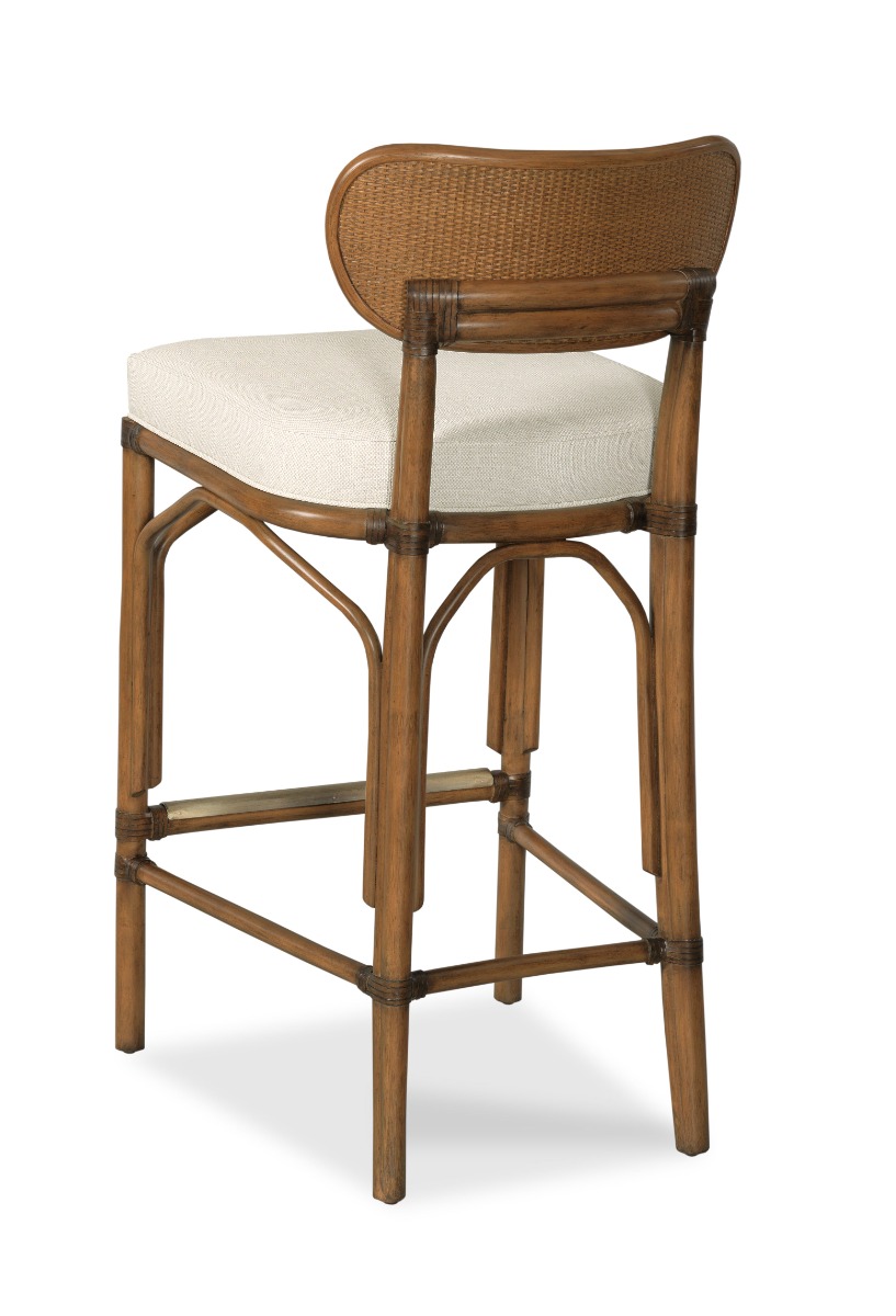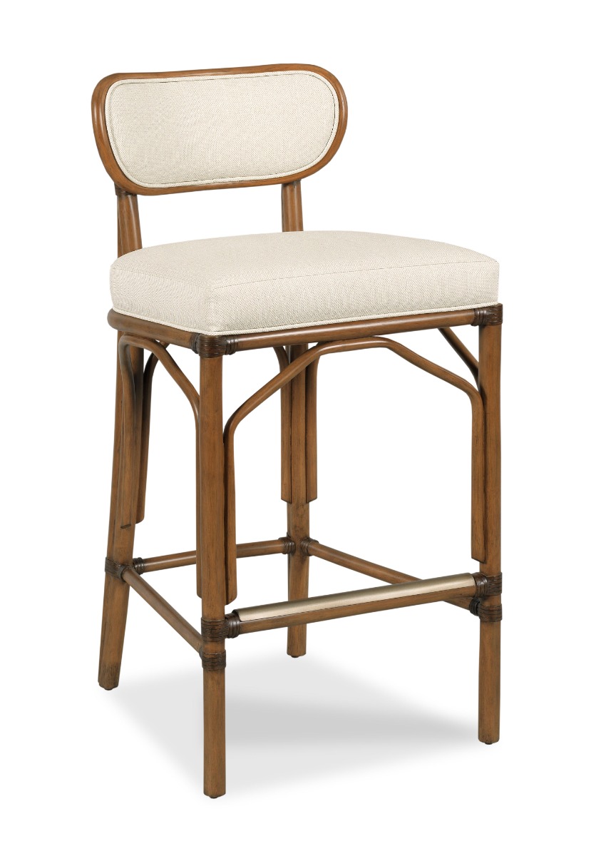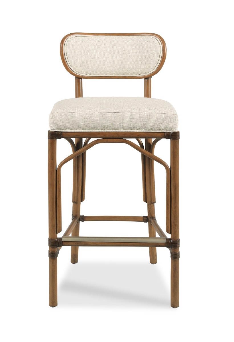A curved rounded back is fitted with padded upholstery above an upholstered seat elevated on a myriad of aluminum pole members for corner posts and brackets.Material: Rattan solids & bindings
