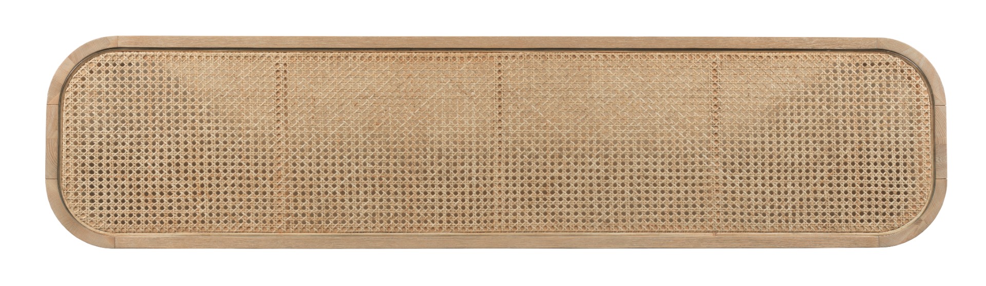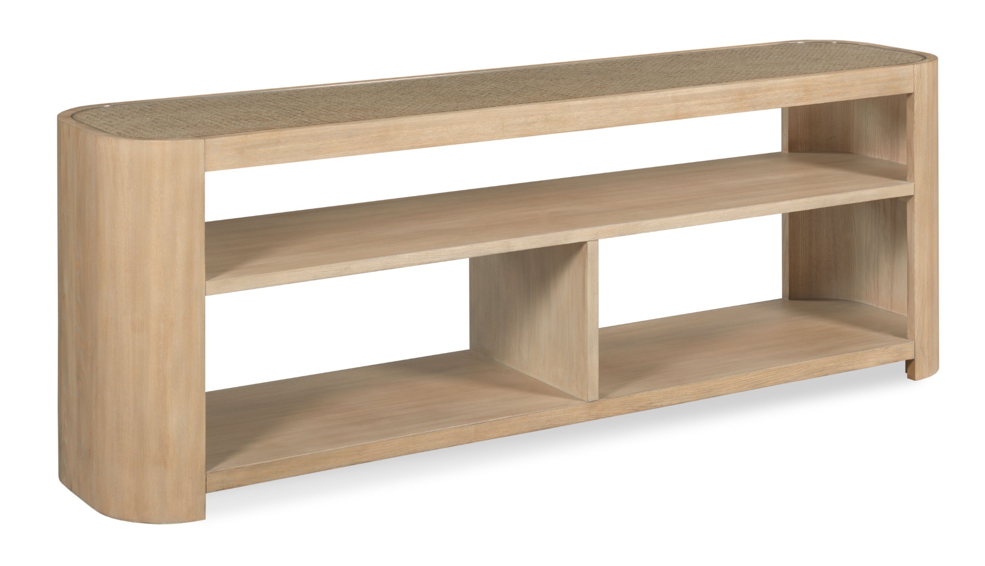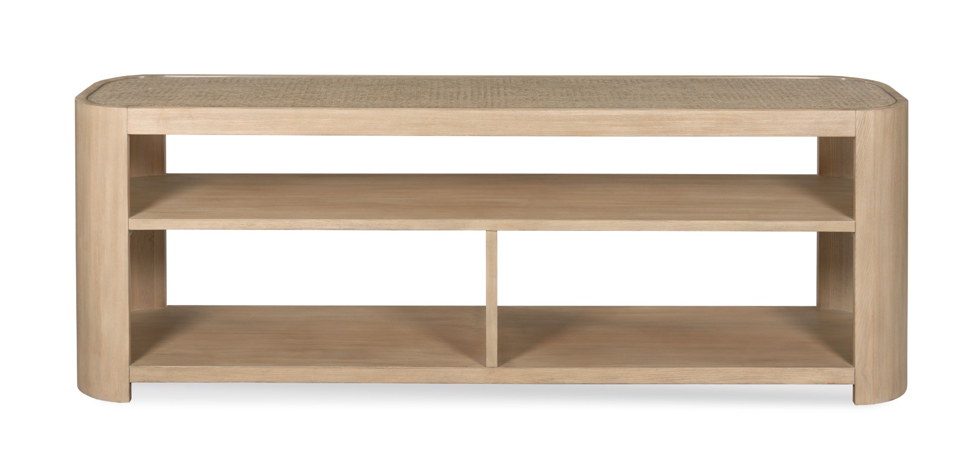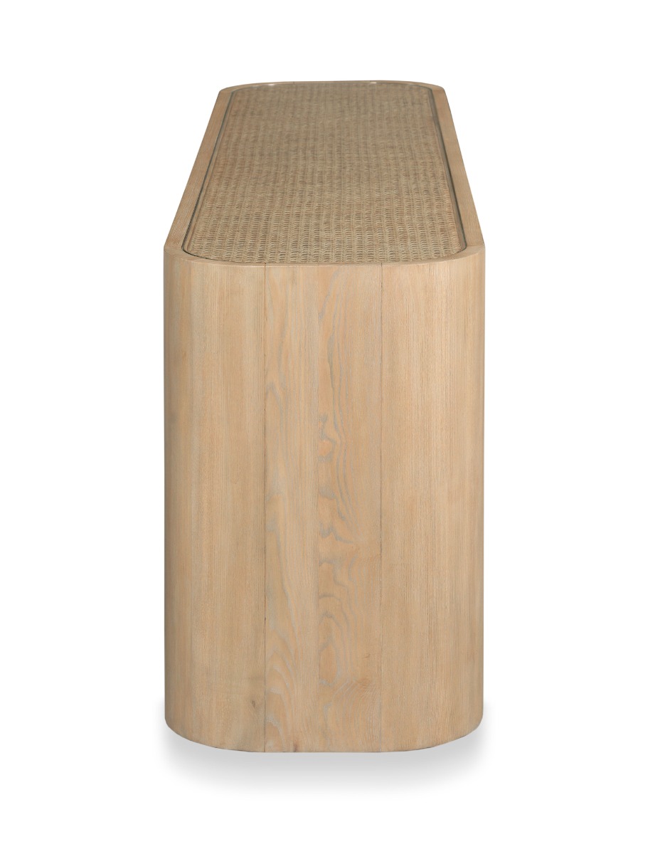 Clean lines and minimalism define this wonderful table for media or a variety of needs. The inset glass top is fitted above a woven rattan field elevated on rounded corner legs that are joined by a myriad of shelves for electronic components or display.Material: hardwood solids and tempered glass