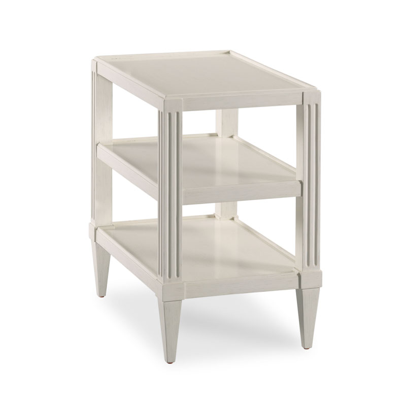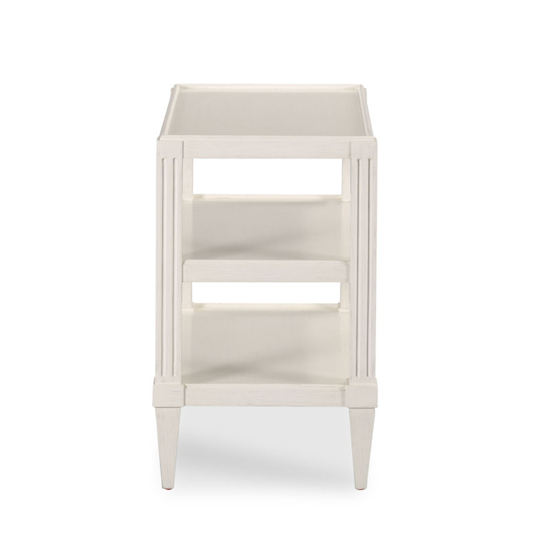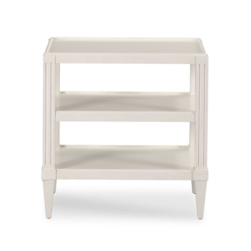 A rectangular top rests over two shelves supported by fluted corner posts that taper.Material: Hardwood solids and veneer