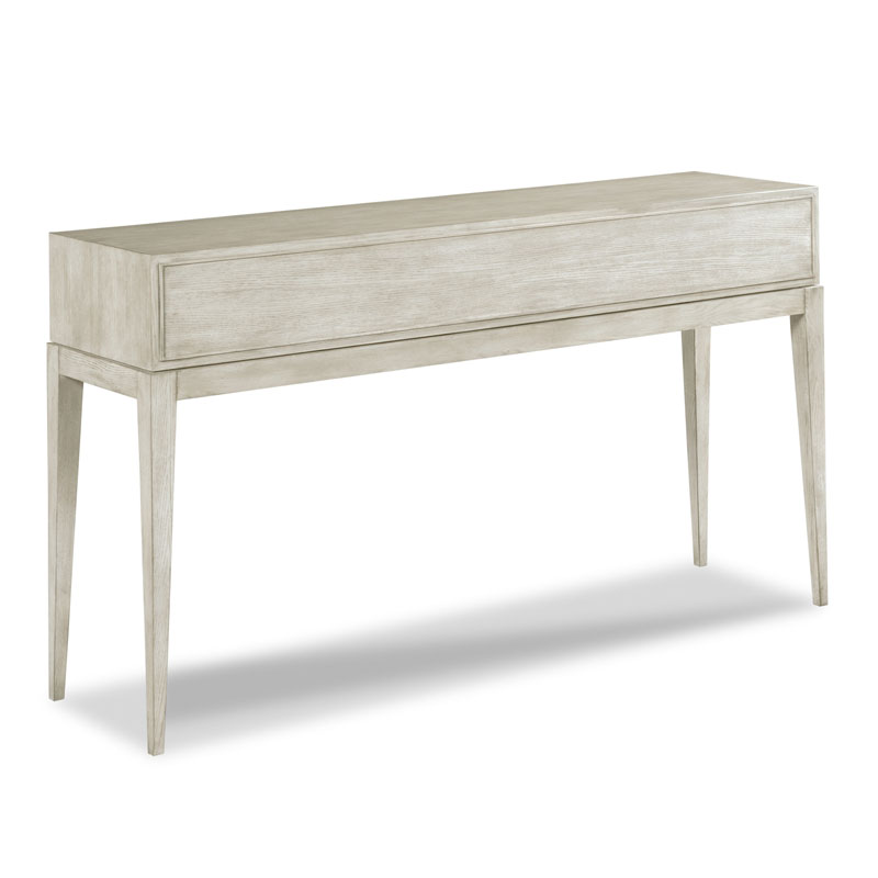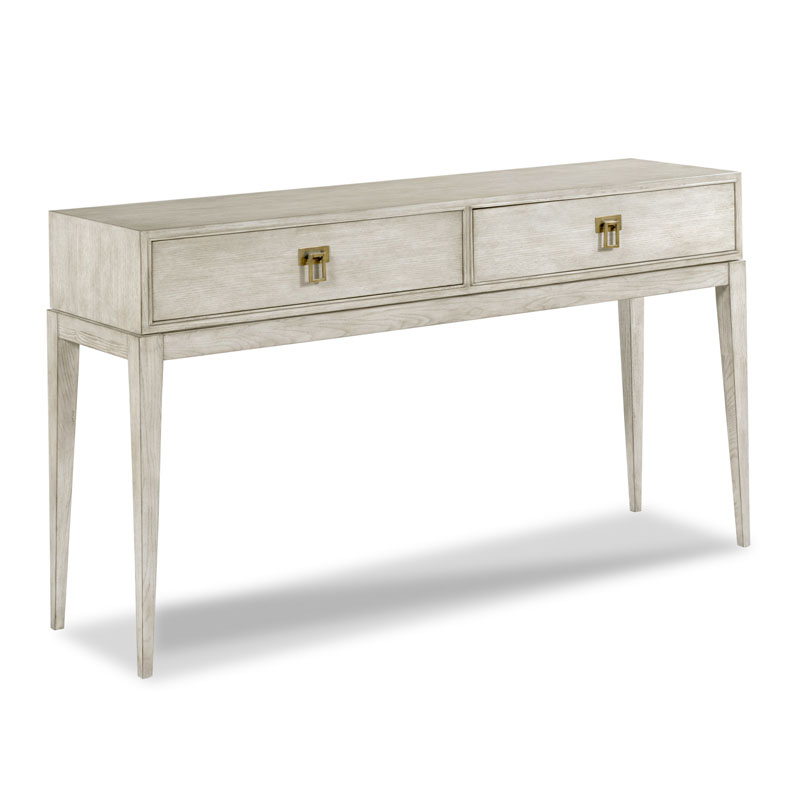 A rectangular top rests over a pair of handy apron rail drawers fitted with custom brass pulls elevated by four gracefully tapering corner posts.Material: Ash solids and ash veneer
