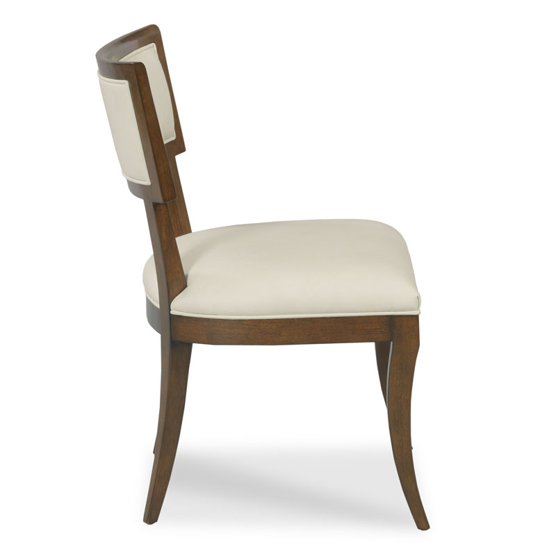 A charming dining chair with 19th Century French style roots. The curved crest rail is incised with welted upholstery over an upholstered seat that is elevated on tapering saber legs.Material: Hardwood solids
