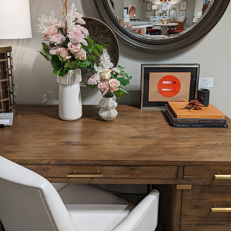 A wonderfully functional desk adapted from Japanese originals from the late 17th century. Our modernized design has authentic corner brackets called Herikanagu and a rectangular oak top over a variety of file and storage drawers mounted with brass bar pulls elevated on a metal base.Material: Oak solids and veneer