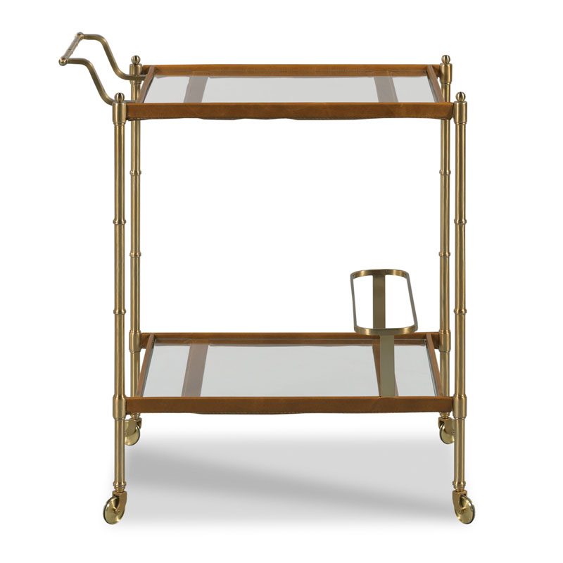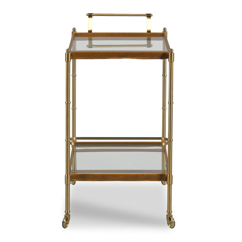 A handy cart crafted from brass solids, styled in the spirit of English Regency originals from the 19th Century. The corner post and handle are fashioned into faux bamboo joined together by rectangular brass rails wrapped in stiched brown leather.Material: brass with leather accents and tempered glass