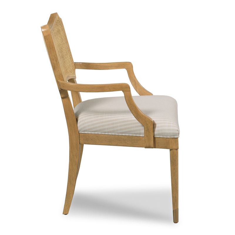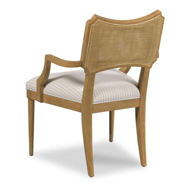 A handsome chair adapted from French Empire styles from the 19th Century. A shaped back is incised with linear natural cane between curved arms above an upholstered seat elevated on tapering legs.Material: hardwood solids and natural cane