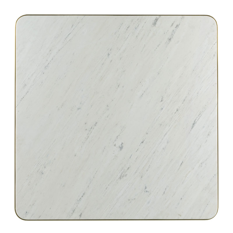 The highlight of this table is the base, designed in the tulip style and featuring a textured ringed metal base with a square Carrara marble top.Material: Stainless steel and Carrara marble
