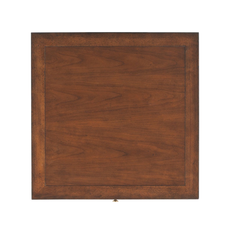 Classic 19th century styling surrounds this handy table with a square top. Elevated on four squared tapering posts that are joined by a low shelf and practical storage drawer mounted with sturdy brass pulls.Material: Hardwood solids and cherry veneer