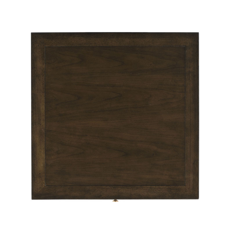 Classic 19th century styling surrounds this handy table with a square top. Elevated on four squared tapering posts that are joined by a low shelf and practical storage drawer mounted with sturdy brass pulls.Material: Hardwood solids and walnut veneer
