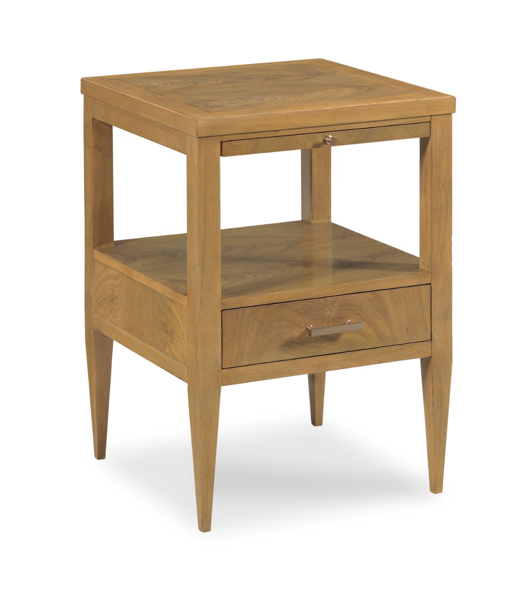 Classic 19th century styling surrounds this handy table with a square top. Elevated on four squared tapering posts that are joined by a low shelf and practical storage drawer mounted with sturdy brass pulls.Material: Hardwood solids and cerejeira veneer