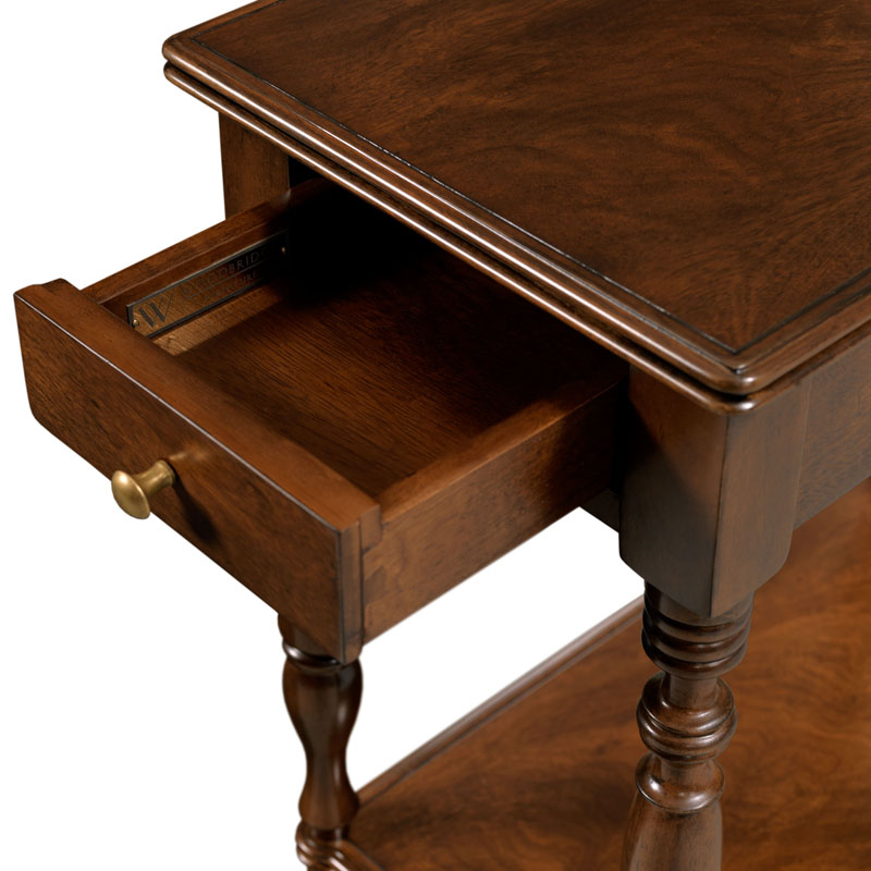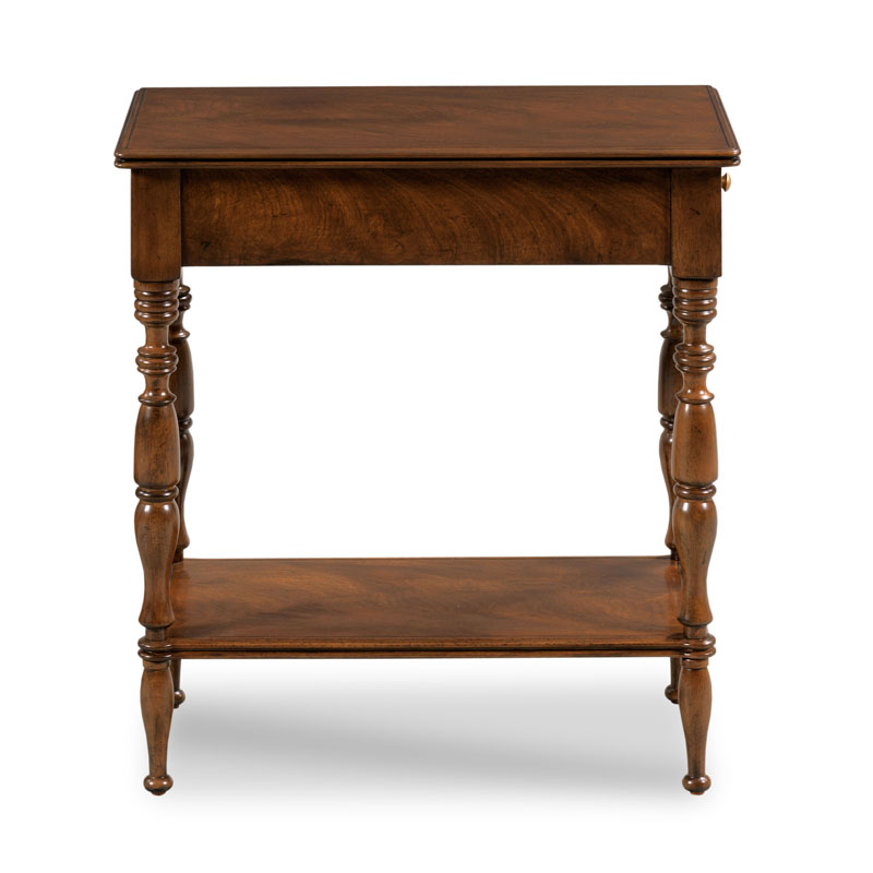 An adorable side table designed in the spirit of the 19th century styles made famous by West Indies craftsmen of the era. A rectangular swirl Cerejeira top rests over intricately turned multi ring corner posts that support an apron rail drawer and a low shelf.Material: Hardwood solids & Cerejeira veneer