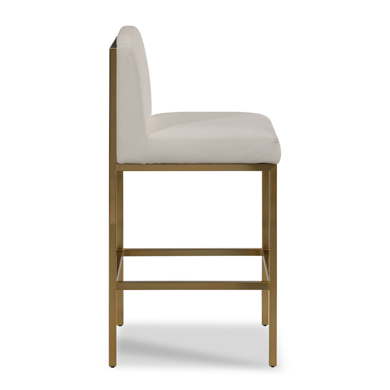 This post modern stool features linear styling with an upholstered back and seat that are elevated on a stainless steel base of square posts and a low stretcher.Material: Stainless steel with PVD coated brass