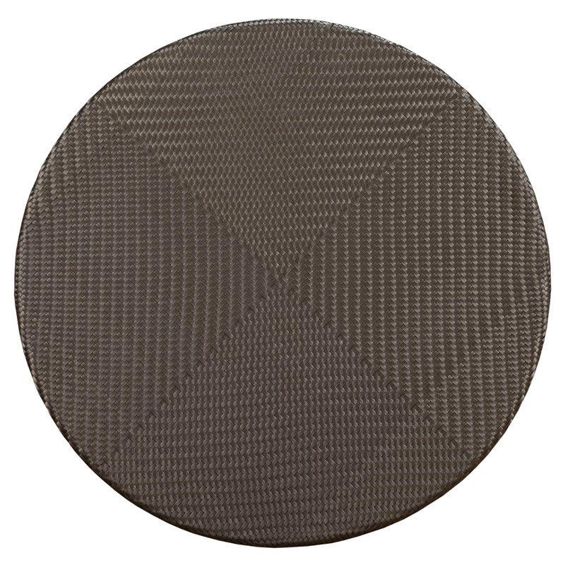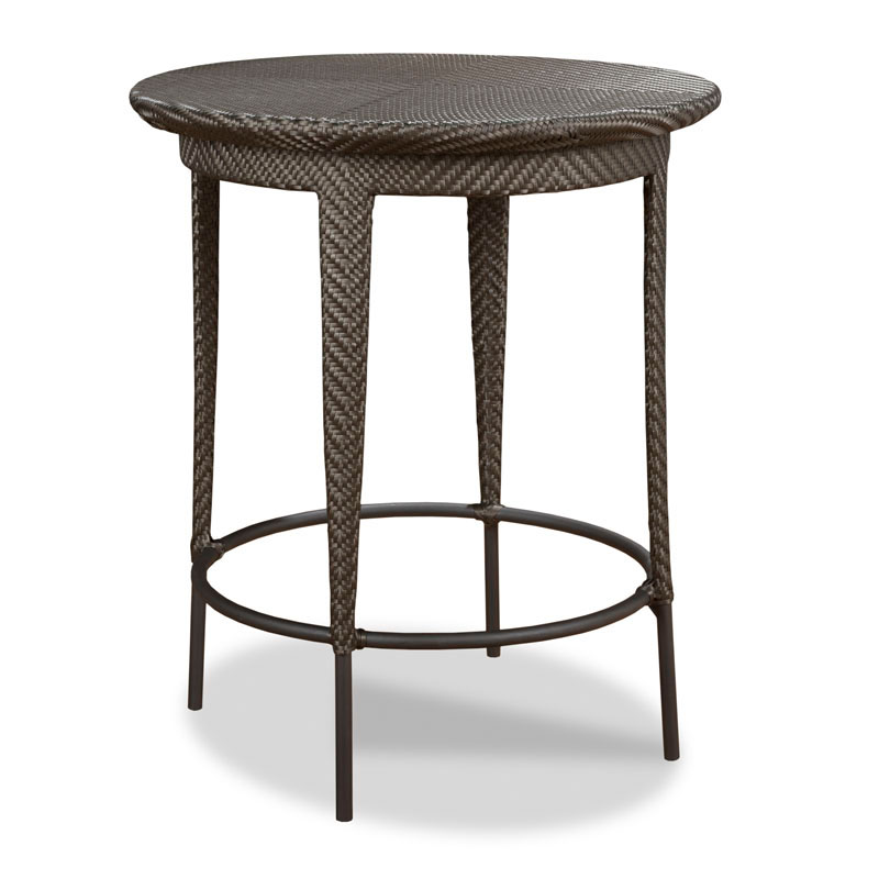 A round woven top with tempered glass is mounted on four tapering legs that terminate to exposed nickel.Material: Powder Coated Aluminum with Handwoven Synthetic Fiber
