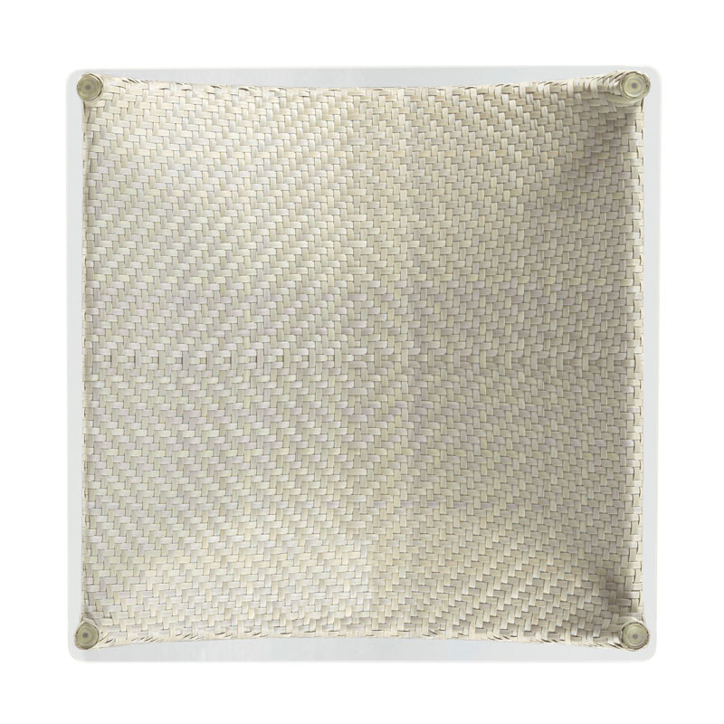 A square tempered glass top rests over four round posts that are enveloped in intricately handwoven synthetic fiber.Material: Powder Coated Aluminum with Handwoven Synthetic Fiber