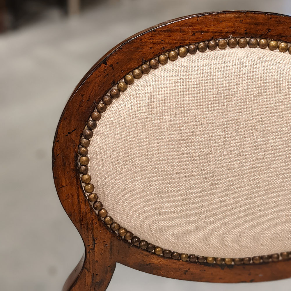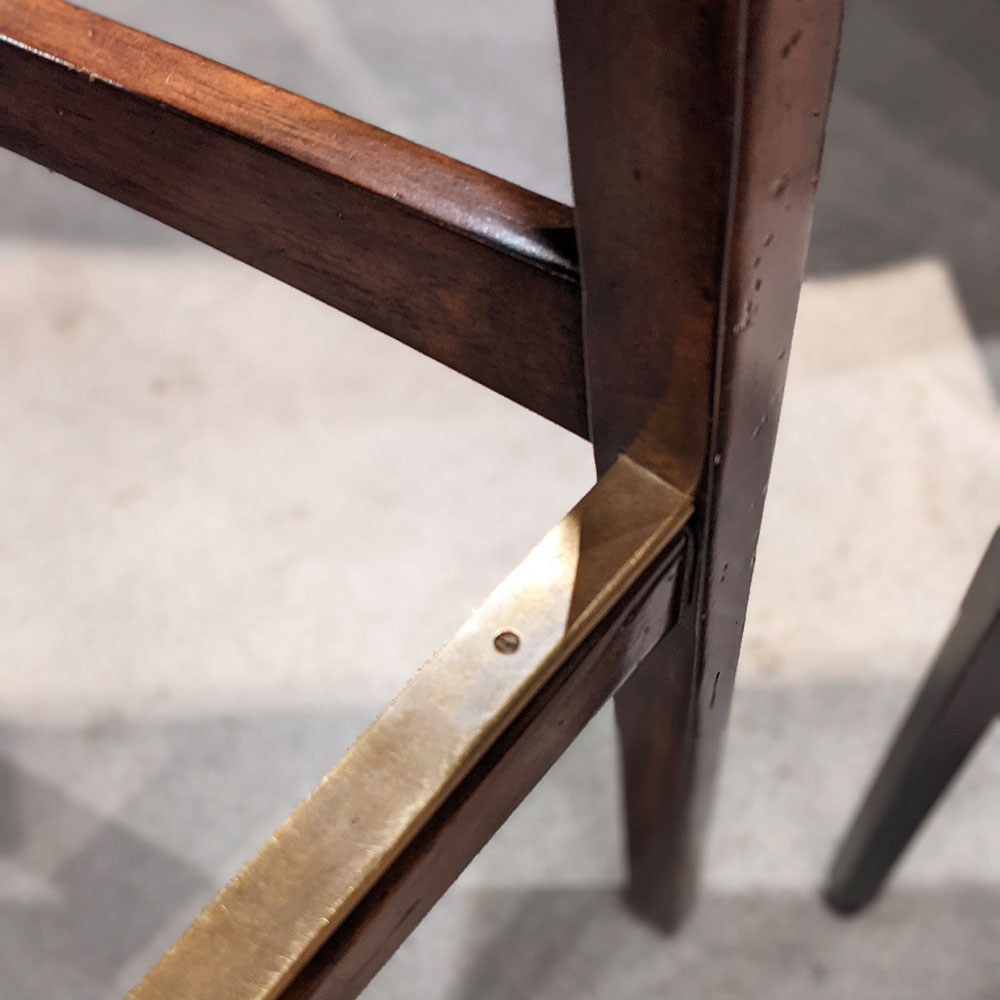 A sleek design with graceful tapered legs that are joined by low stretchers and curved apron rails. The stool features an upholstered seat and back and is finished with nail head trim.Material: Hardwood solids