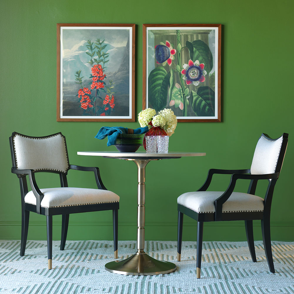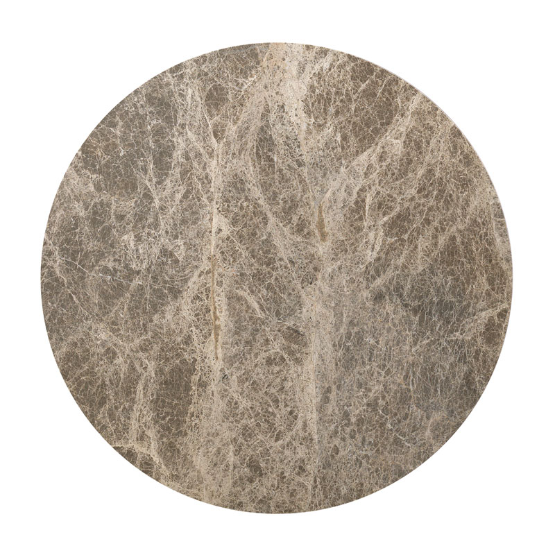This sophisticated cafe table has a rounded polished Emperador grey marble top resting over a central column turned round with sculpted details over a circular metal base.Material: metal and Emperador grey marble