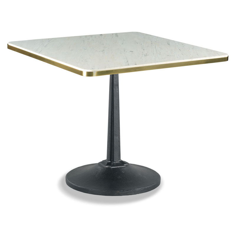 A square marble top rests over a cast metal tapering central column and base in a gunmetal finish.Material: Forged Steel & Iron Base with Carrara Marble Top