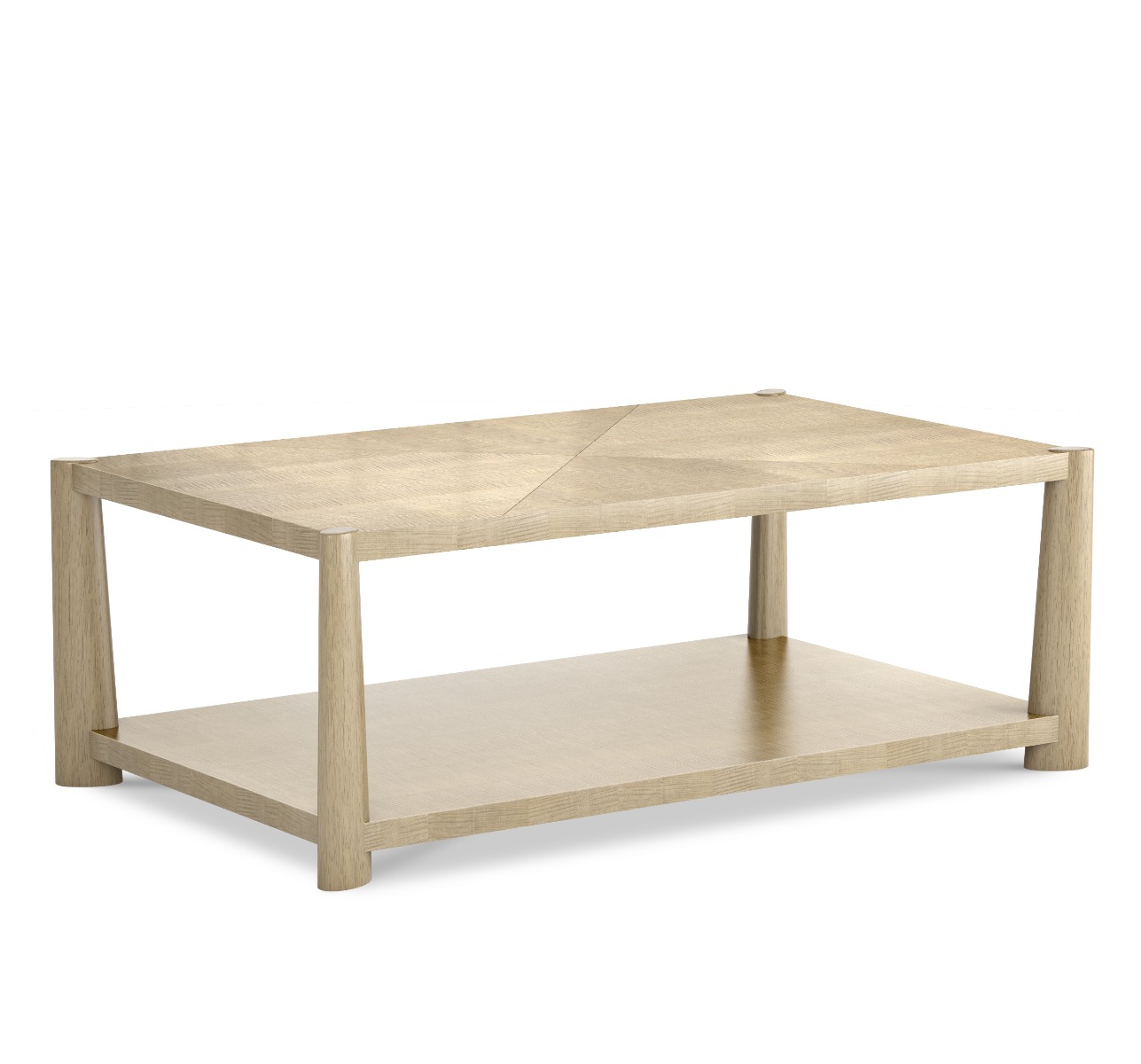 A charming low modern table with a rectangular top that is veneered with rich quarter sawn English sycamore elevated on tapering oval shaped corner legs that are joined by a low shelf.Material: Hardwood solids and figured sycamore veneer